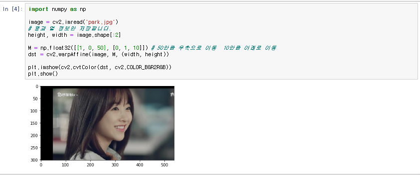 cv2.warpAffine(image, M, dsize) 이미 위치 변경