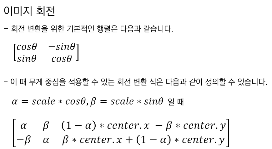# 이미지 회전(cv2.getRotationMatrix2D(center, angle, scale))