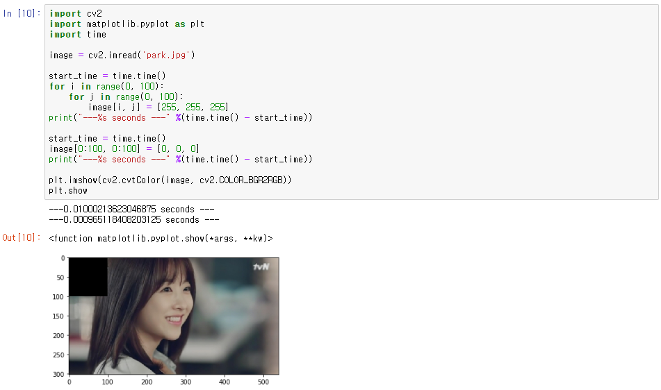 for문을 돌려서 픽셀을 변경하는 것과 0:100 슬라이싱을 사용해 픽셀 변경하는 것 두가지를 적어놓았습니다.