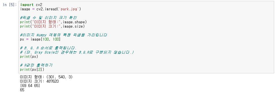 # 반환 값: Numpy 객체( 행 열 색상: 기본 BGR) BGR 형태로 처리됨
