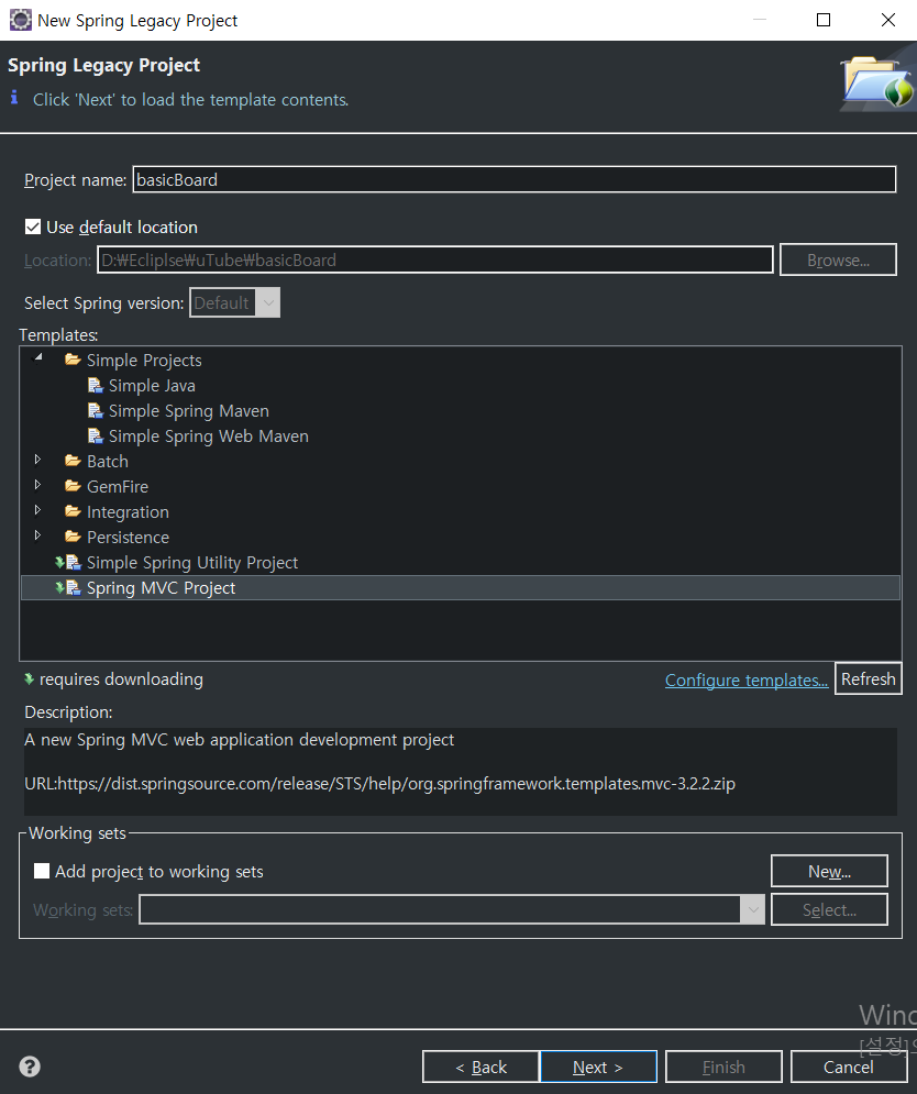 Next를 하고 저는 프로젝트의 이름은 basicBoard로 하고 템플릿은 Spring MVC Project를 하였습니다.