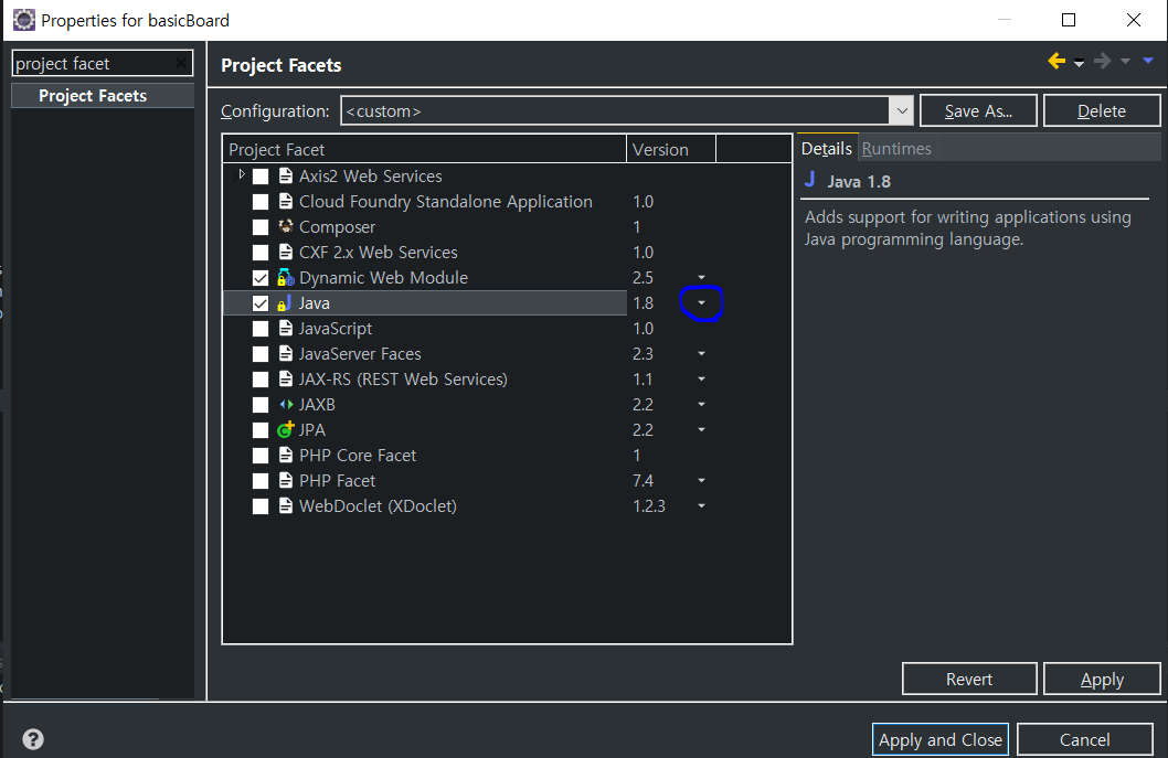 이제 project facets 로 들어가서 JAVA의 버전을 1.8로 바꿔주고 APPLY를 하겠습니다.