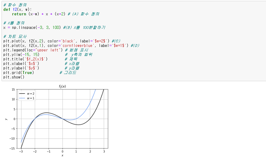 그래프도 매끄러워지고, 그리드와 라벨, 제목 범례가 들어갔습니다. 이제 함수 f(x)=(x-2)x(x+2)가 x축과 반나는 점은 -2, 0, 2라는 것이 명확해 졌습니다.(검은 선 : w=2). 또한 w=1일 때, 즉 f(x) = (x-2)x(x+2)이 되면 x축과 만나는 점이 -2, 0 ,1이 되는 것도 알 수 있습니다. (파란선 : w = 1)