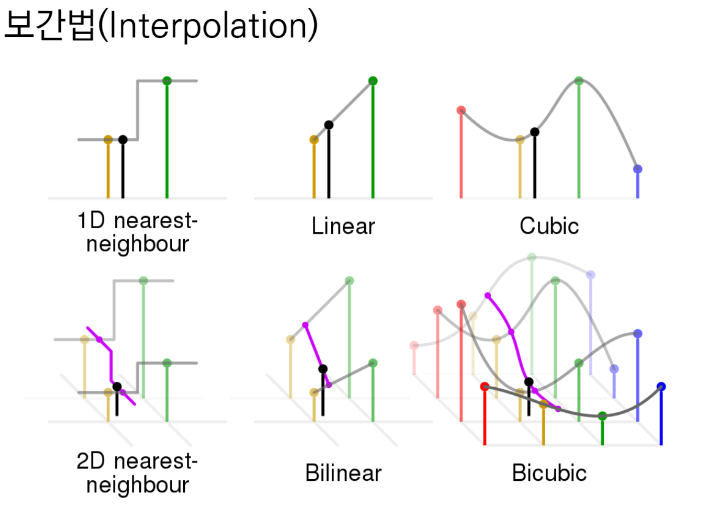 여기서 알아야 될 것이 Interploation(사이즈가 변할 때 픽셀 사이의 값을 조절하는 방법을 의미) 입니다.