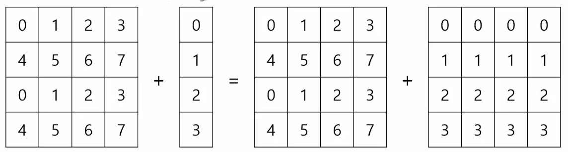 - Numpy는 서로 다른 형태의 배열을 연산할 때는 행 우선으로 수행됩니다.