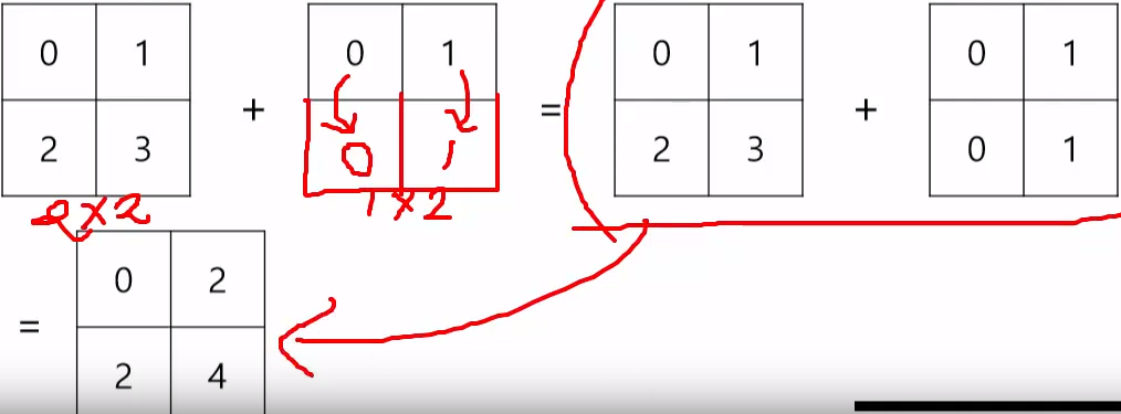 브로드 캐스트: 형태가 다른 배열을 연산할 수 있도록 배열의 형태를 동적으로 변환해줍니다.
