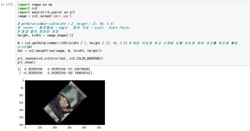 # 이미지 회전(cv2.getRotationMatrix2D(center, angle, scale))