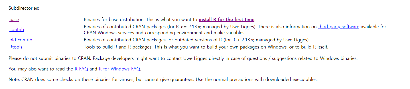 저는 윈도우를 사용하기에 Download R for Windows 를 클릭