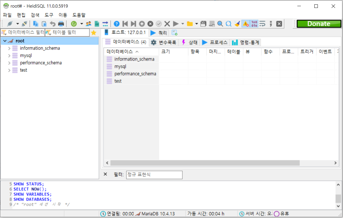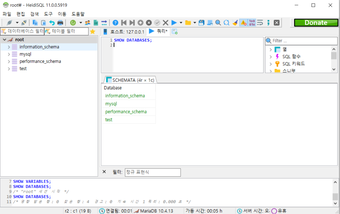 마지막으로 쿼리 문에 show databases; 를 입력하고 F9 를 누른 후 정상적으로 작동이 되는지 확인해 보겠습니다.