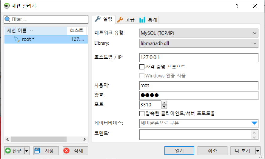 신규 버튼을 클릭하고 설치시에 입력하였던 패스워드와 포트번호를 적어줍니다. 신규로 만든 계정 또한 rename을 통하여 root로 바꾸어 주었습니다.