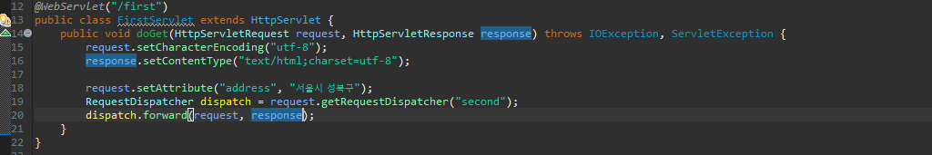 첫 번째 서블릿에서 두 번째 서블릿으로 전달되는 request가 브라우저를 거치지 않고 바로 전달되었습니다.