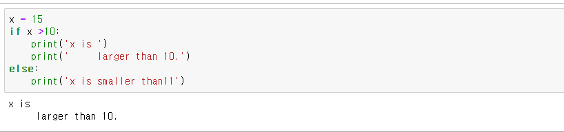 다음과 같이 첫 행에서 x값으로 15를 대입하고, if의 x>10이라는 조건은 True입니다.