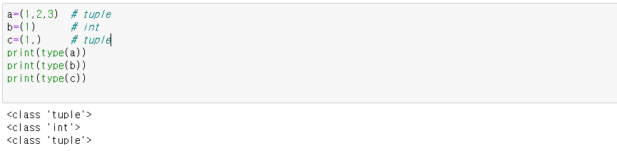 (1,2)는 tuple이지만 (1)은?? 튜플이 아닙니다. ()는 연산의 순서를 나타내는 일반적인 괄호로 간주합니다. 길이가 1인 tuple은(1,)과 같이 쉼표( , ) 를 붙입니다.