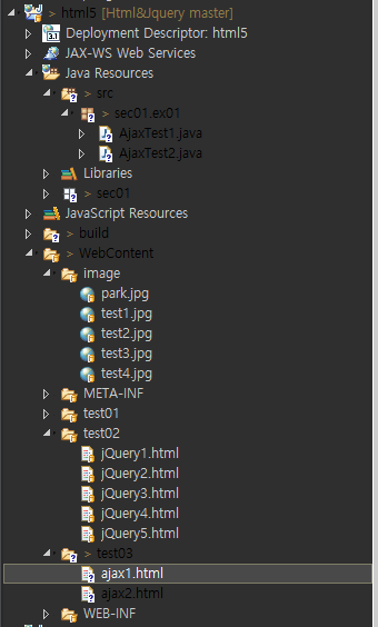 sec01.ex01 패키지를 만들고 AjaxTest1.java, AjaxTest.java를 생성합니다. 그리고 test03 폴더에 ajax1.html, ajax2.html을 추가하겠습니다.