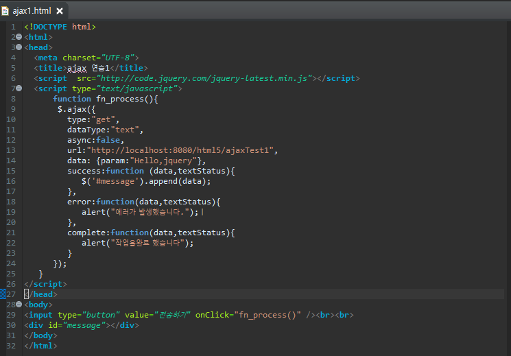 ajax1.html 은 제이쿼리 Ajax기능을 이용해 서블릿에 매개변수 이름 param으로 "Hello, jquery"를 서버로 전송하면 서버로부터 받은 메시지를 id가 message인 <div>태그에 표시합니다.