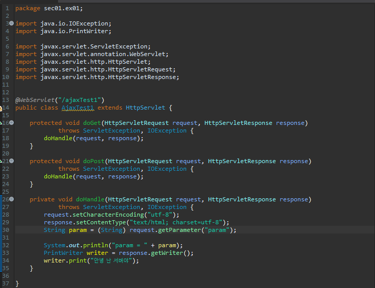 AjaxTest1은 클라이언트에서 Ajax로 메시지를 보내면 이를 처리하는 서블릿입니다. 브라우저에서 매개변수 이름인 param으로 데이터를 보내면 getParameter()를 이용해 데이터를 가져옵니다. 그리고 서블릿에서는 PrintWriter의 print() 메서드의 인자로 응답 메시지를 브라우저에 보냅니다.