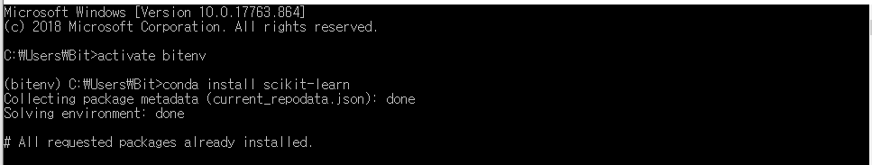 아래와 같이 conda install scikit-learn을 입력하셔서 설치해주시면 됩니다.