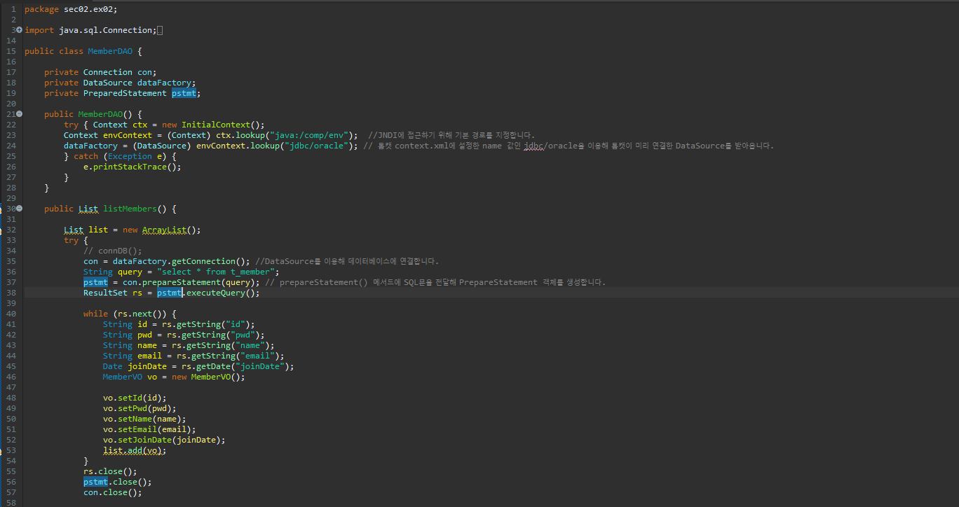 톰캣 컨테이너는 자체적으로 ConnectionPool 기능을 제공합니다. 톰캣 실행 시 톰캣은 설정파일에 설정된 데이터베이스 정보를 이용해 미리 데이터베이스와 연결하여 ConnectionPool 객체를 생성한 후 애플리케이션이 데이터베이스와 연동할 일이 생기면 ConnectionPool 객체의 메서드를 호출해 빠르게 연동하여 작업합니다.