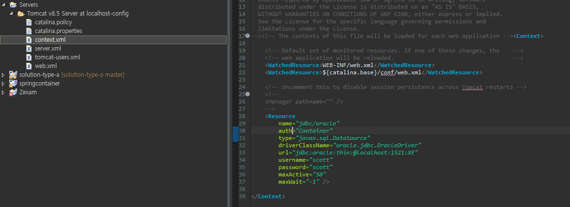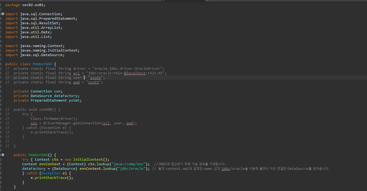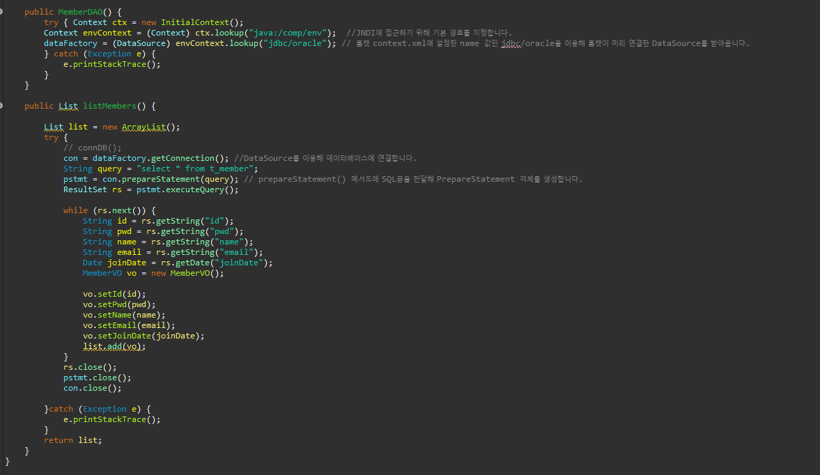 톰캣 컨테이너는 자체적으로 ConnectionPool 기능을 제공합니다. 톰캣 실행 시 톰캣은 설정파일에 설정된 데이터베이스 정보를 이용해 미리 데이터베이스와 연결하여 ConnectionPool 객체를 생성한 후 애플리케이션이 데이터베이스와 연동할 일이 생기면 ConnectionPool 객체의 메서드를 호출해 빠르게 연동하여 작업합니다.