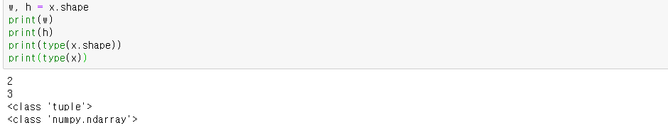 이 출력은()로 둘러싸여 있으므로 tuple형으로 나타납니다. 다음과 같이 입력하여 w와 h에 각각 2와 3을 저장할 수 있습니다.