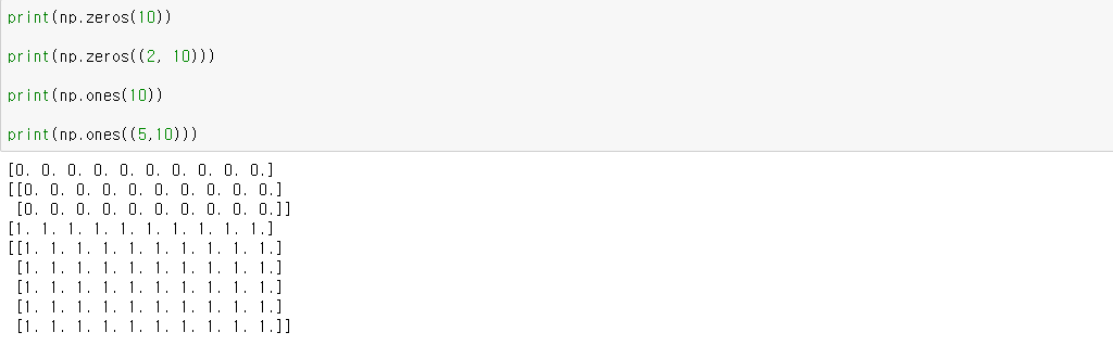 모든 요소가 0인 ndarray는 np.zeros(size)로 만들 수 있습니다. np.ones(size)도 동일합니다.