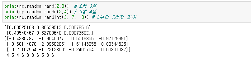 또한 np.random.randint(low, high, size)를 사용하려면 low에서 high까지 임의의 정수값으로 이루어진 size 크기의 행렬을 생성할 수 있습니다.