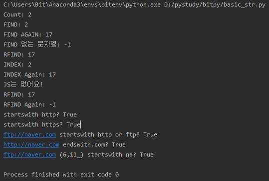 Python 검색메서드 연습,count, find, rfind, index, startswith, endswith