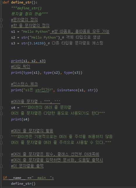 Python 문자열 정의 연습, 타입확인type(), 인스턴스체크isinstance(), 여러줄 주석