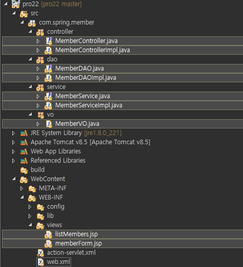 1. MemberControllerImpl 클래스를 다음과 같이 구현합니다. 자신의 속성 memberService에 설정 파일에서 생성된 memberService 빈을 주입하기 위해 반드시 setter를 구현해야 합니다.