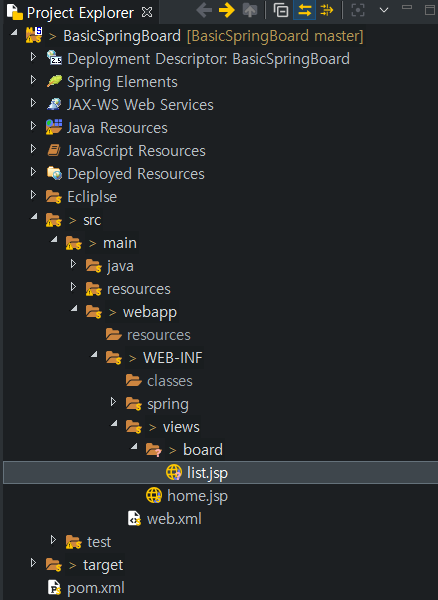 WEB-INF > views 에 board라는 폴더를 하나 생성하고 거기에 list.jsp를 생성합니다.